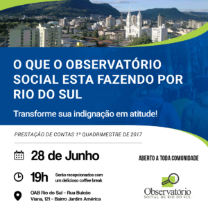 O Observatório Social de Rio do sul, cujo objetivo é acompanhar e qualificar a aplicação dos recursos públicos, apresentará, no próximo dia 28 de junho, às 19h, por intermédio de seu presidente Jean Sandro Pedroso, o Relatório do 1º Quadrimestre de 2017. A divulgação será realizada na Sede da OAB Subseção de Rio do Sul, na Rua Bulcão Viana, 121, Jardim Amarica.